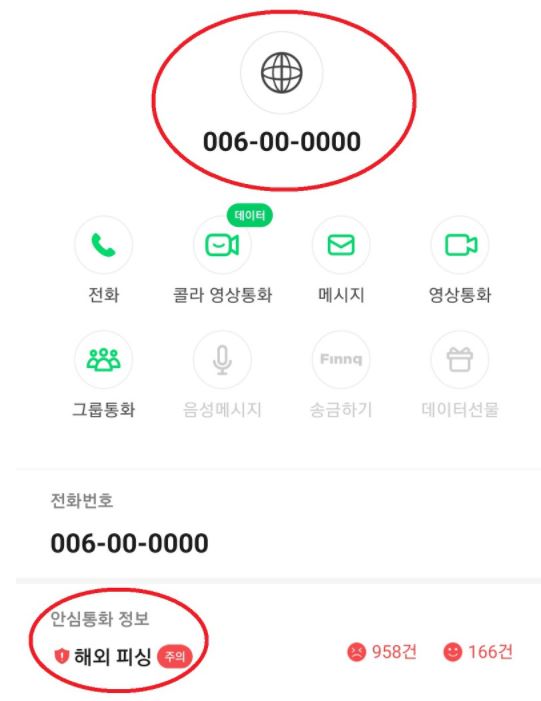 이 T전화 어플은 아랫부분에 안심통보 정보라는 부분에 해외 피싱이라고 표시가 되죠.