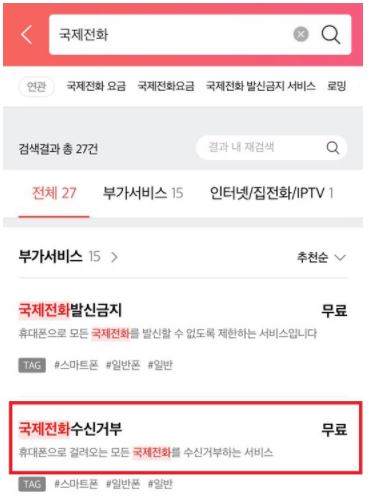 간접 차단은 통신사별로 제공하는 국제전화 수신차단 부가서비스에 무료 가입하는 방법입니다. SKT를 사용하는 아이폰 기준으로 설명해볼게요.