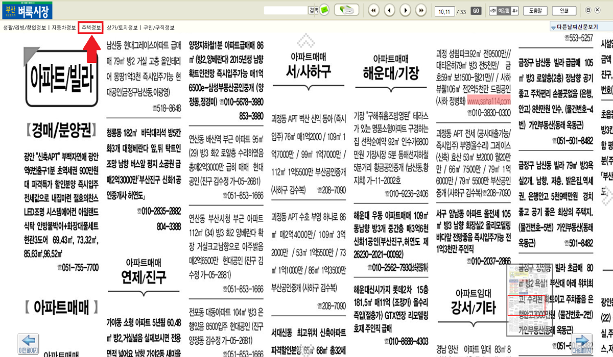 ▲ 좌측 상단에 주택정보를 누르시고 보고 싶은 부분을 마우스 클릭하시면 확대돼서 신문 정보를 확인하실 수 있습니다.