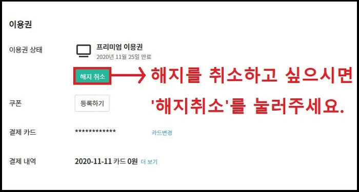 ▲ 프리미엄 이용권 우측에 있는 해지를 눌러주세요. 해지를 못하게 하려고 그런가, 매우 작게 표기해놨네요.