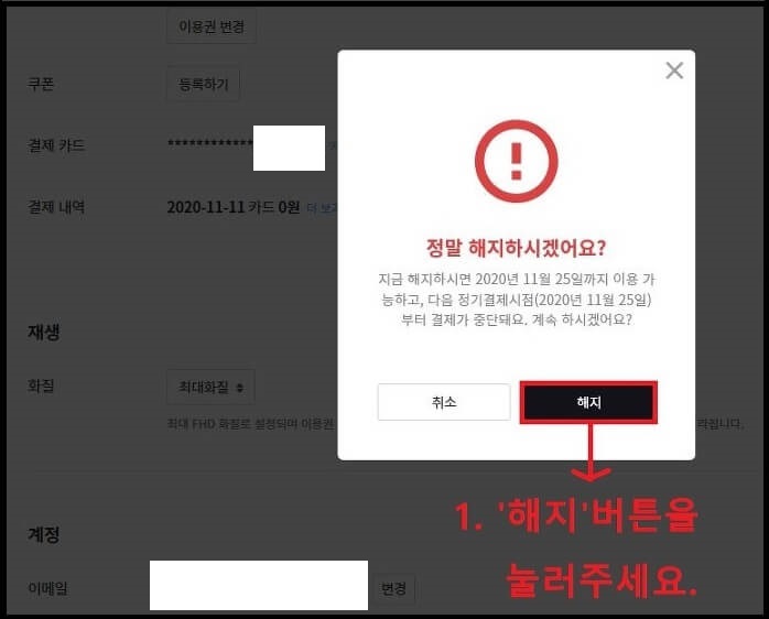 ▲ 정말 해지하시겠어요?라는 경고문이 뜹니다. 과감하게 해지를 눌러주세요!!
