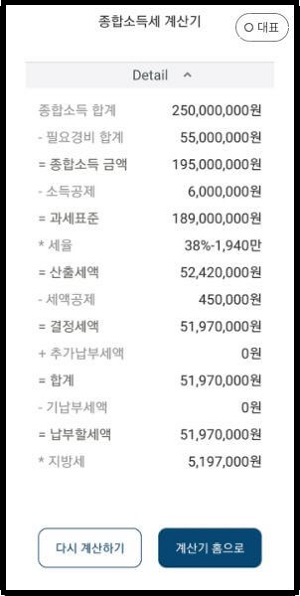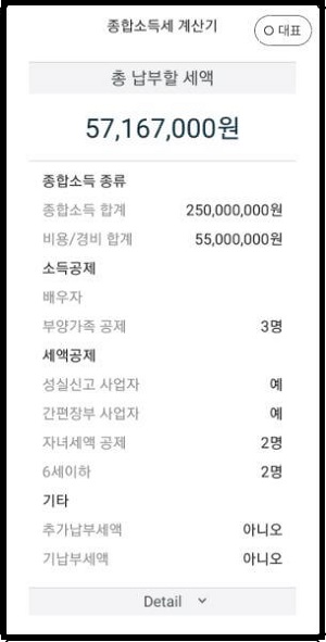 ▲ 위에서 예시로 든 것처럼 선택했더니 종합소득세가 5,700만 원이 넘네요. 하단부의 Detail을 누르시면 더욱 상세하게 세금 정보를 알 수 있습니다.