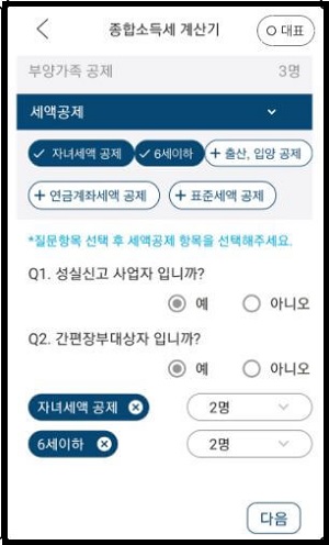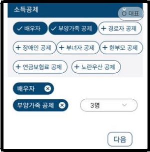 ▲ 복부인 앱에서 종합소득의 종류와 금액을 작성하고 다음을 누르셨다면 소득공제 부분이 뜰 텐데요. 공제받을 수 있는 부분을 [+] 버튼을 통해서 추가해주시고, 인원을 변경해주시면 되겠습니다. 배우자가 있고, 부양가족이 3명만 있을 때를 가정하여 계산하겠습니다. 원하는 부분을 모두 선택하셨다면 하단에 다음을 눌러주세요.