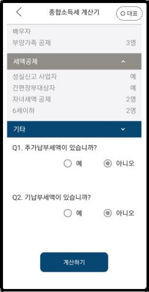 ▲ 복부인 앱에서 [세액공제] 부분까지 완료했다면 기타 부분이 활성화될 텐데요. 추가납부세액이 없으시거나, 기납부세액이 없으신 분들은 둘 다 '아니오'를 선택해주시고 계산하기를 눌러주시면 되겠습니다.