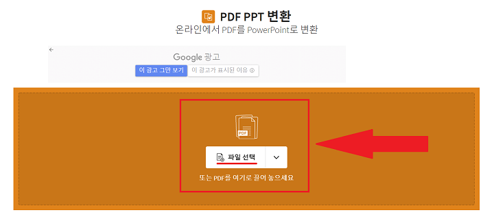 ▲ 해당 사이트에 접속하면 PDF PPT 변환 보이실 텐데요. 그 밑에 파일 선택을 눌러주세요. PDF 파일을 직접 끌어다가 옮기셔도 됩니다.
