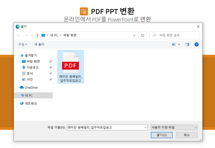 ▲ 최근 한참 이슈였던 래미안 원 베일리 모집공고 pdf파일을 ppt 파일로 변환시켜보겠습니다. ppt로 변환하고자 하는 pdf파일을 찾아서 열기를 눌러주세요.