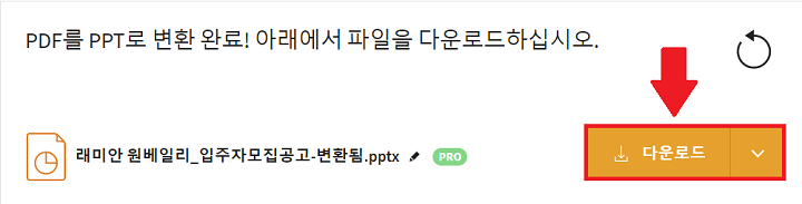 ▲ 변환이 완료가 되면 ppt 파일 확장자인 pptx 확장자로 변하게 됩니다. 우측에 다운로드를 눌러서 다운로드하시면 되겠습니다.